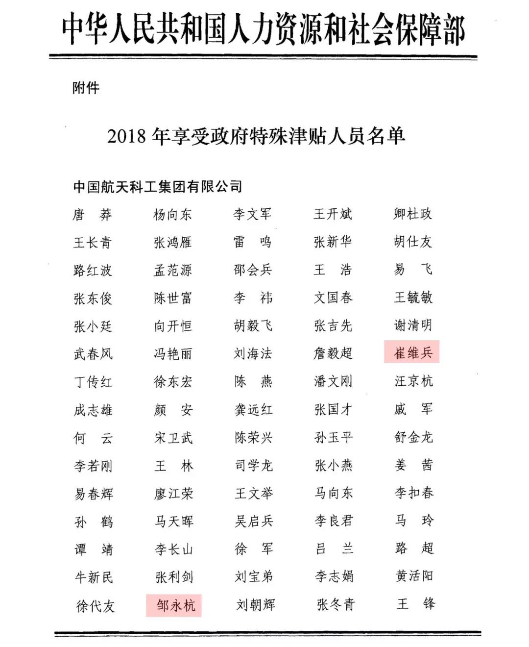 近日,中華人民共和國人力資源社會保障部公布了2018年享受政府特殊津貼人員名單。航天通信總裁、黨委副書記崔維兵,智慧海派總裁鄒永杭獲此榮譽。