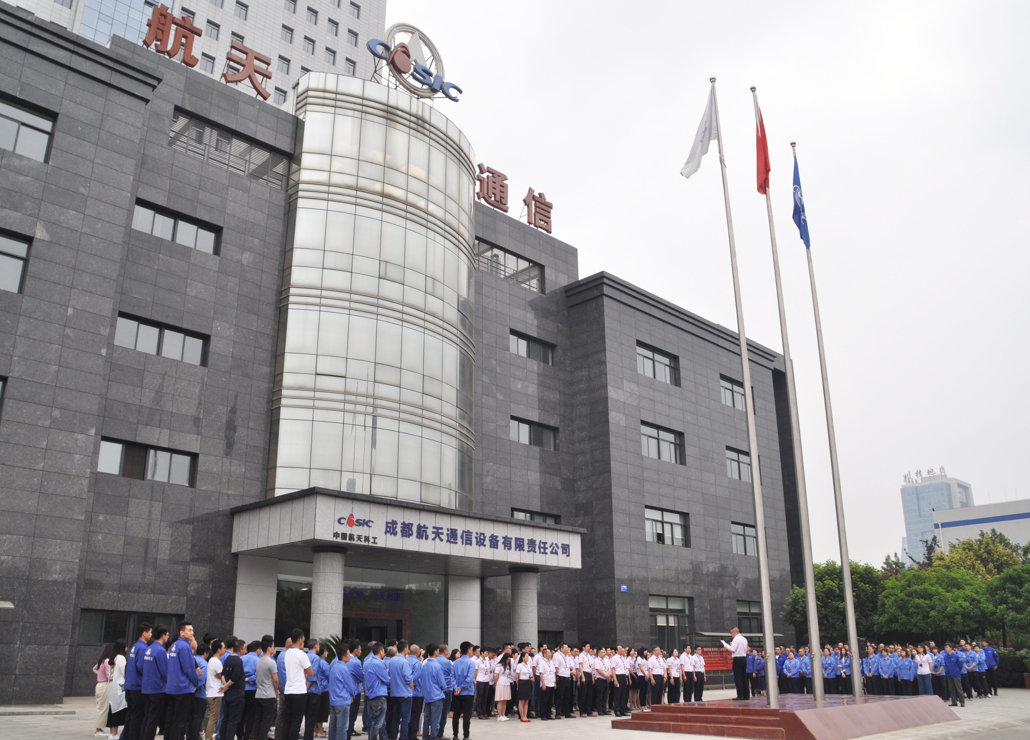 成都航天圍繞“逐夢航天 合作共贏主題舉行升旗儀式。公司領導班子、中層干部、團員青年、職能部門全體人員以及部分事業部、制造部員工約300人英姿颯爽,整齊列隊。在激昂的國歌聲中,五星紅旗冉冉升起,在雄壯有力的《航天科工之歌》中,藍、白色的集團公司司旗隨風舞動,彰顯了我國航天事業的蒸蒸日上。