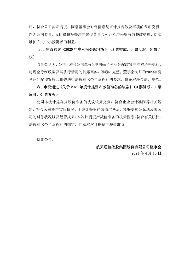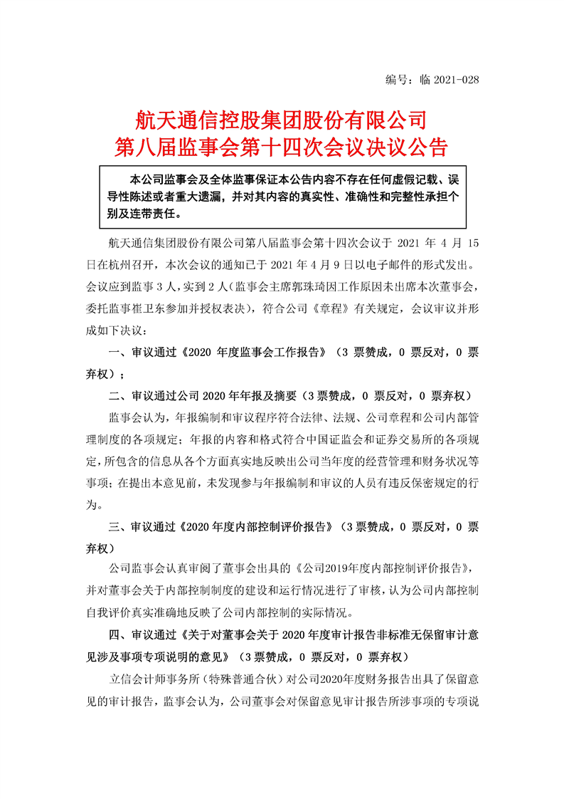 航天通信控股集團(tuán)股份有限公司八屆十四次監(jiān)事會(huì)決議公告