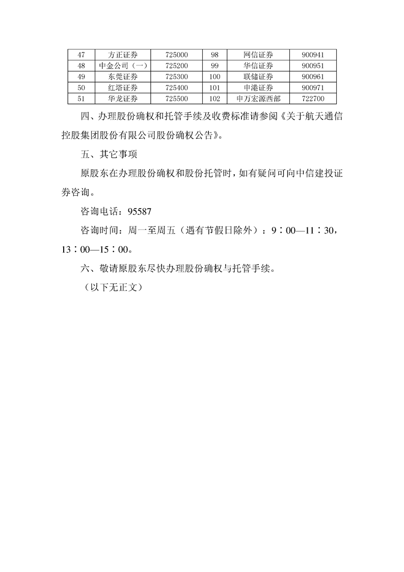 關于航天通信控股集團股份有限公司原流通股股東股份確權和托管的催示公告