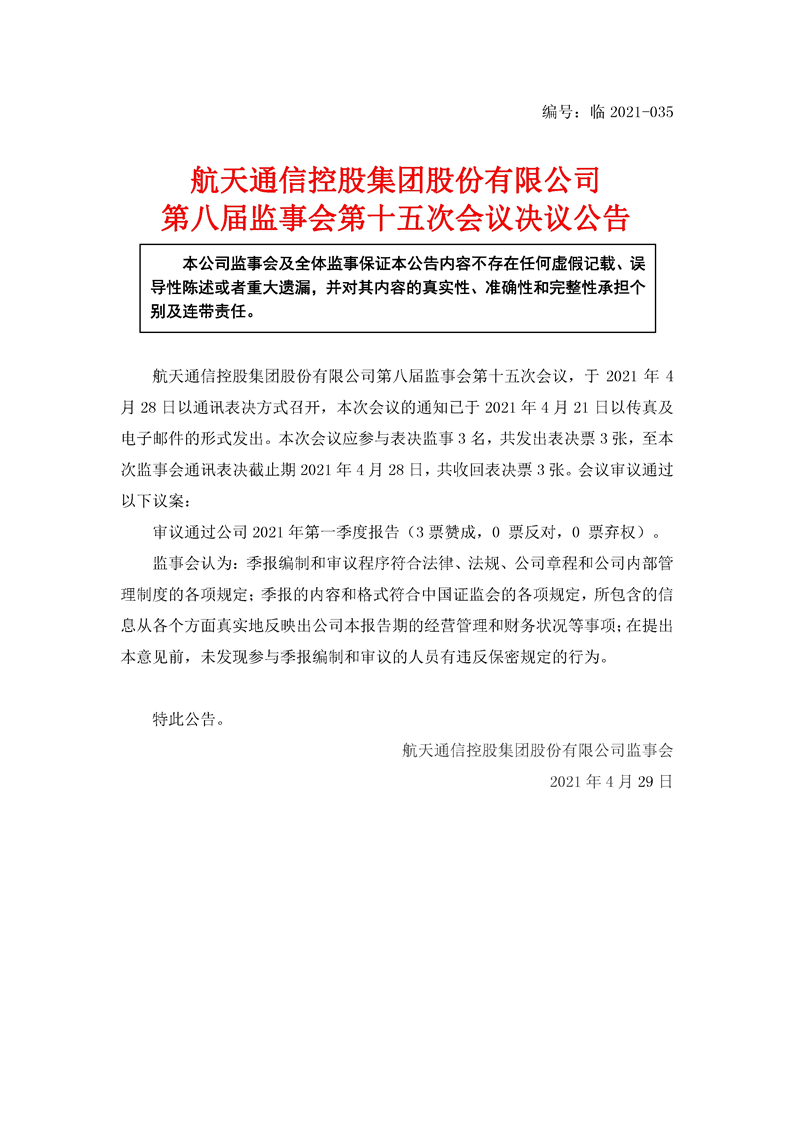航天通信控股集團股份有限公司八屆十五次監事會決議公告