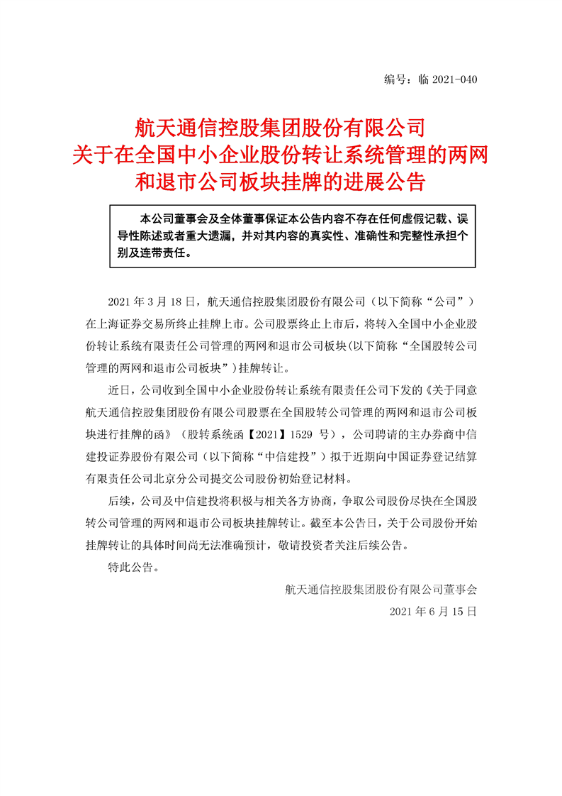 航天通信控股集團(tuán)股份有限公司關(guān)于在全國中小企業(yè)股份轉(zhuǎn)讓系統(tǒng)管理的兩網(wǎng)和退市公司板塊掛牌的進(jìn)展公告
