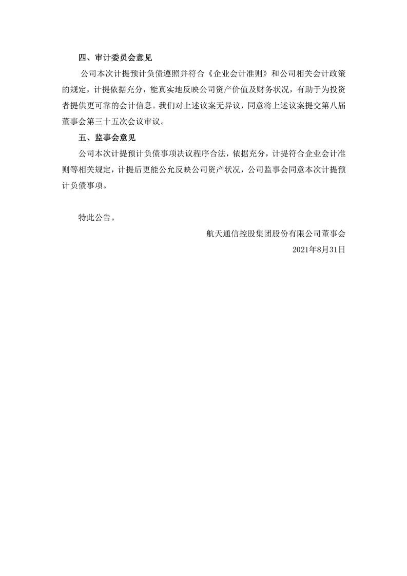 航天通信控股集團股份有限公司關于計提預計負債的公告
